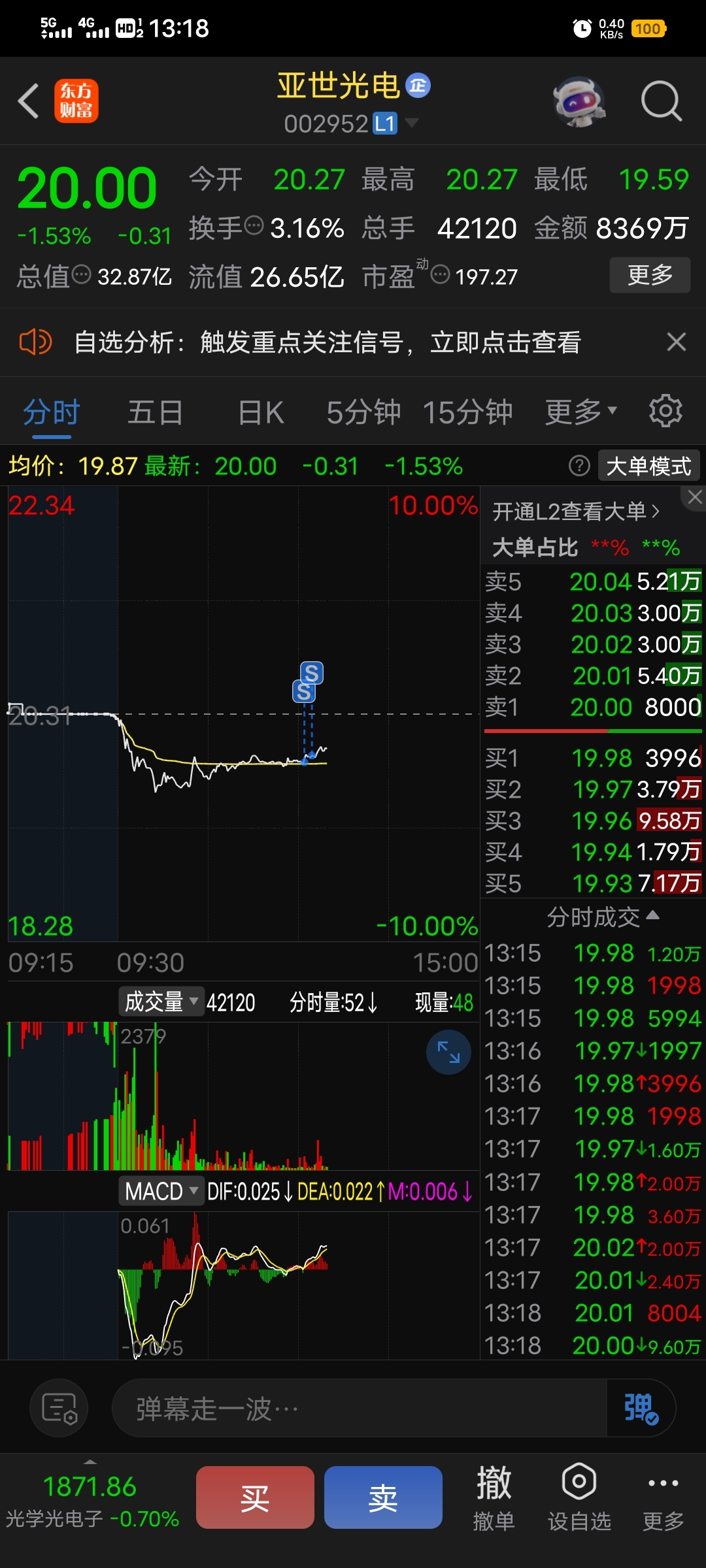 $亚世光电(SZ002952)$ 我真怀疑主力可以监控散户 等半天不涨 一卖立马就涨