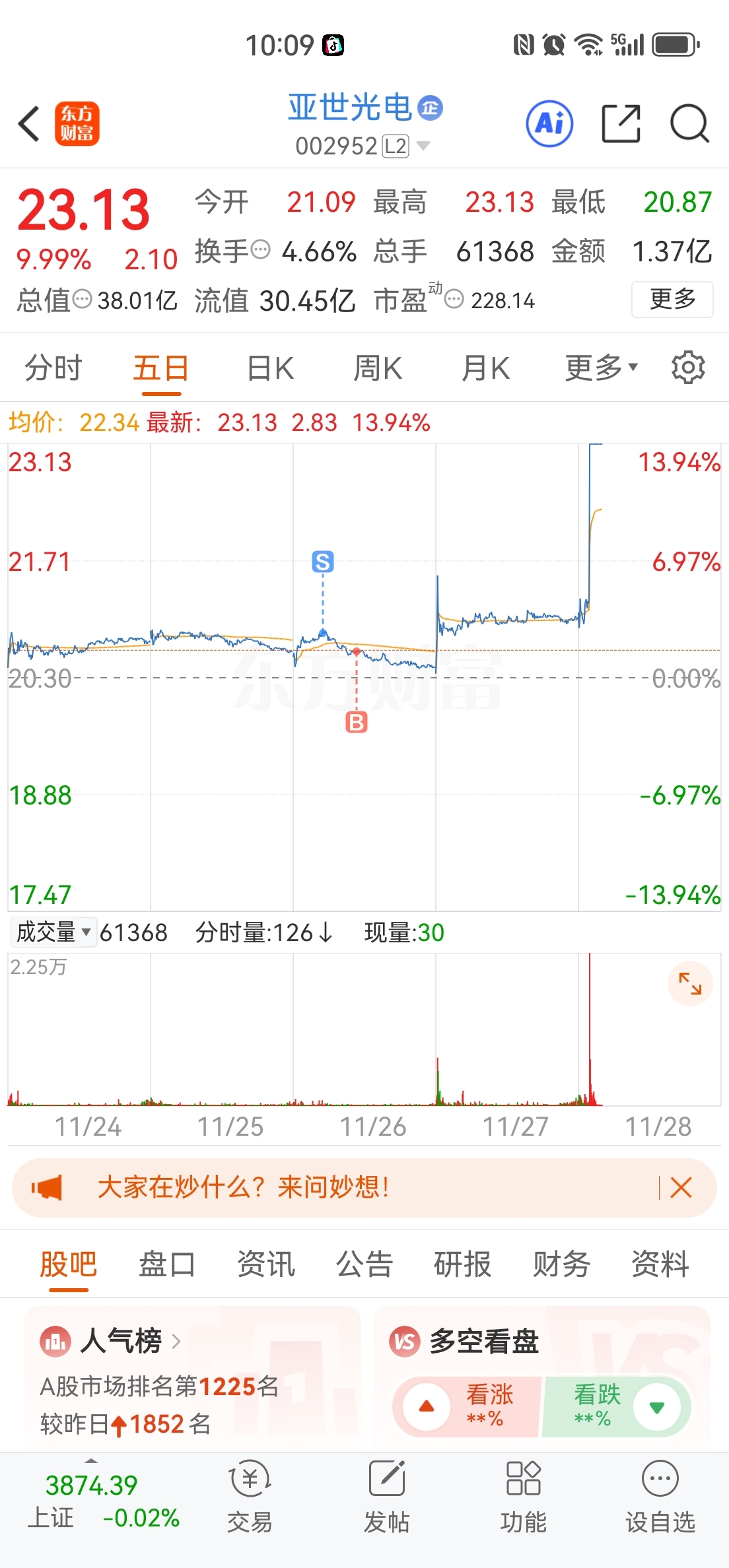 还可以还可以,昨天没卖了,昨天看换手率挺不错的,而且昨天控盘那么高,又突破20.95控盘(打上20.95后就没有跌破),就知道今天有肉吃