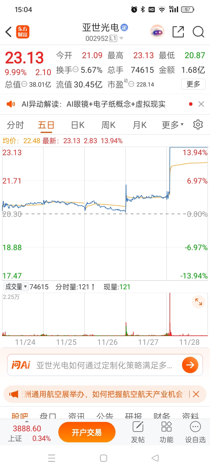 $亚世光电(SZ002952)$ 站在风口上猪都会飞!我看到200倍股!盘子太小了!拉到200倍才区区6000亿市值一点都不高!ai眼镜充满想象力!现在又是20年难遇的大牛市?天空才是尽头!牛市就是要有泡沫!大家都发财了!