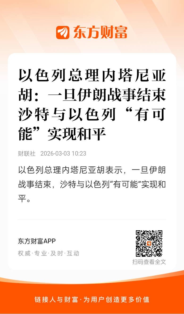 以色列总理内塔尼亚胡表示,一旦伊朗战事结束,沙特与以色列“有可能”实现和平。