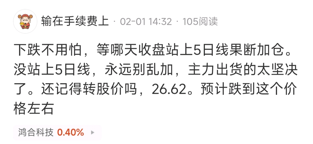 $鸿合科技(SZ002955)$ 2月1号那天我说过了,跌倒26.62左右,然后站上5日线是为反转看多。我太懂这股了,90%仓位在31出的(不信可以翻我之前的评论)。