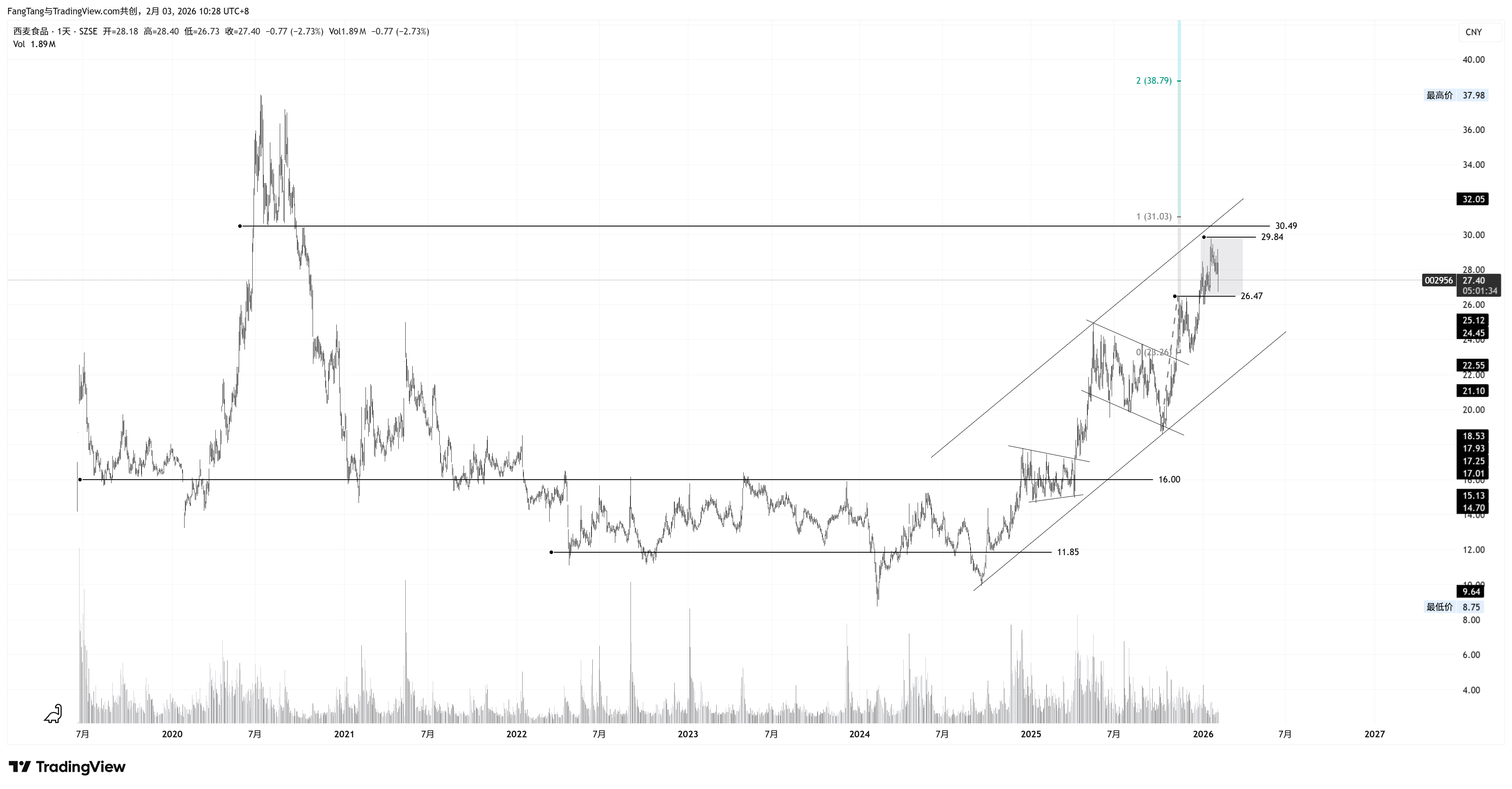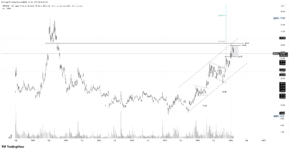 哎呀呀,又往下了一下。考虑还是受30阻力的调整,先看26.5-30之间的区间整理