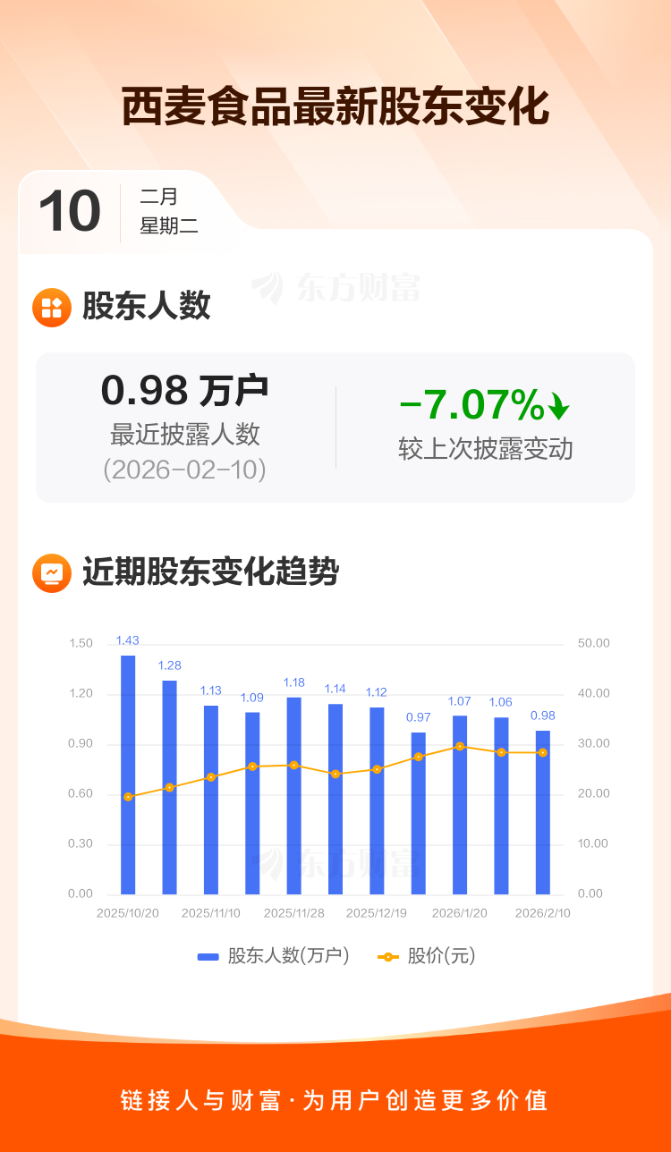 西麦食品最新披露数据显示,截至2月10日公司股东户数为9814户,较上期(2026年1月30日)减少747户,降幅为7.07%。户均持有流通股数量由上期的2.11万股上升至2.27万股,户均持股金额由上期的59.92万元增加至64.39万元。
