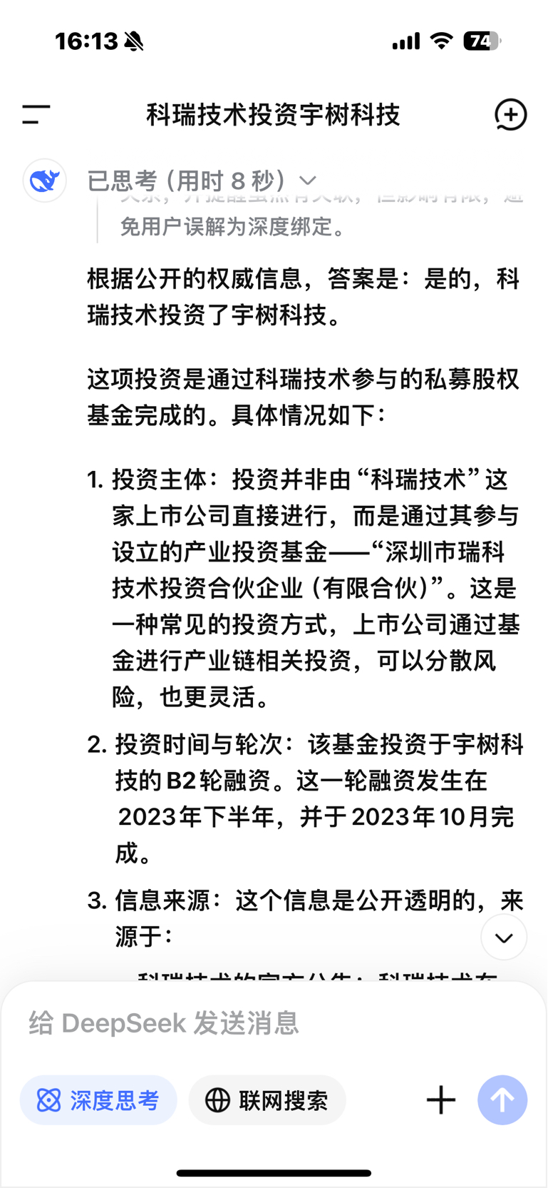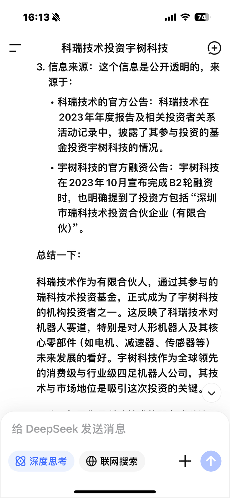 科瑞技术确实有投资宇树科技,在23年公告中就有披露