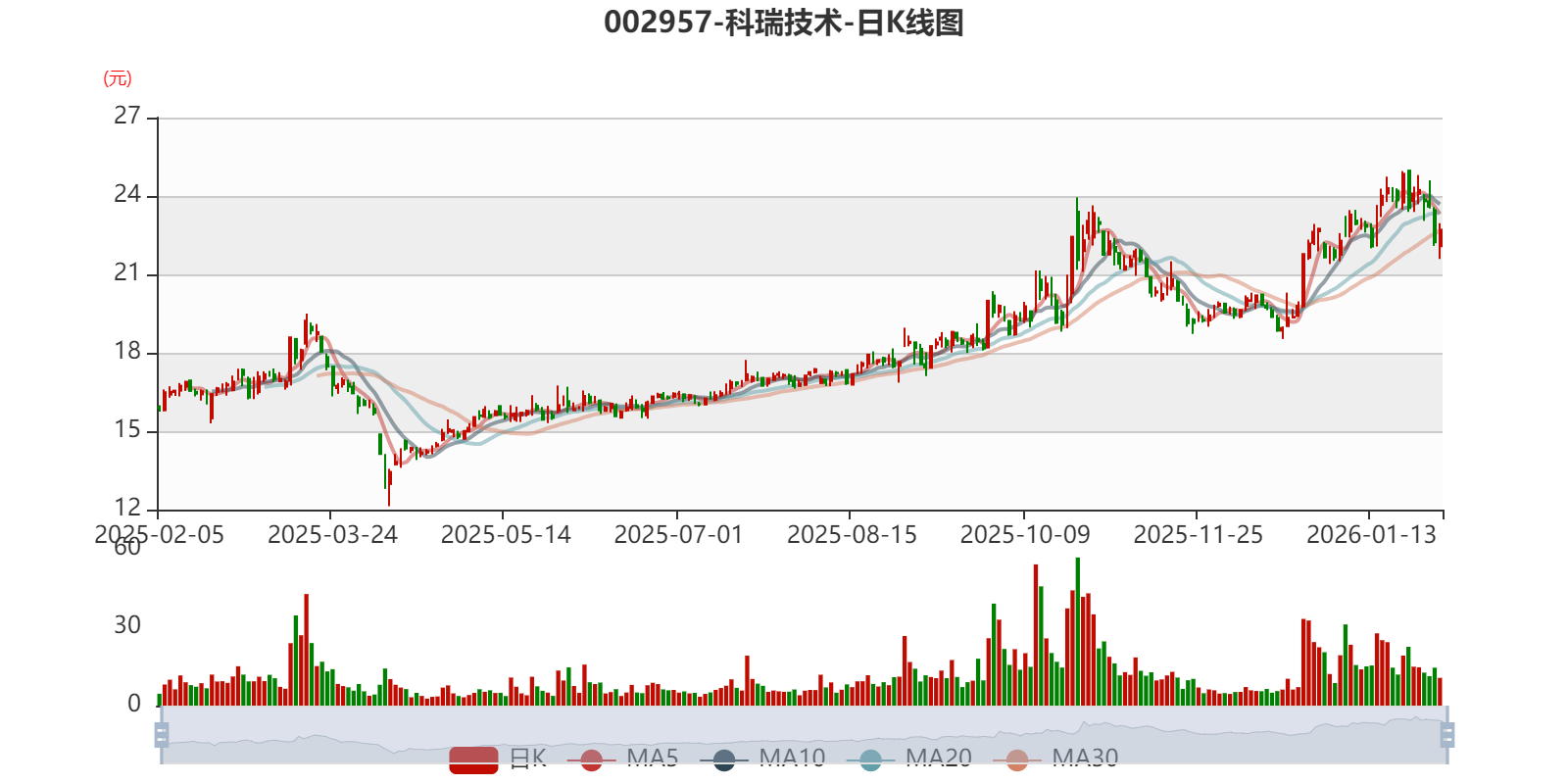 中证智能财讯科瑞技术(002957)1月30日晚间披露2025年度业绩预告,预计2025年归母净利润2.35亿元至3亿元,同比增长68.61%-115.25%;扣非净利润预计1.3亿元至1.9亿元,同比增长4.69%-53.01%;基本每股收益0.5626元/股-0.7183元/股。以1月30日收盘价计算,科瑞技术目前市盈率(TTM)约为31.79倍-40.59倍,市净率(LF)约2.98倍,市销率(TTM)约3.89倍。