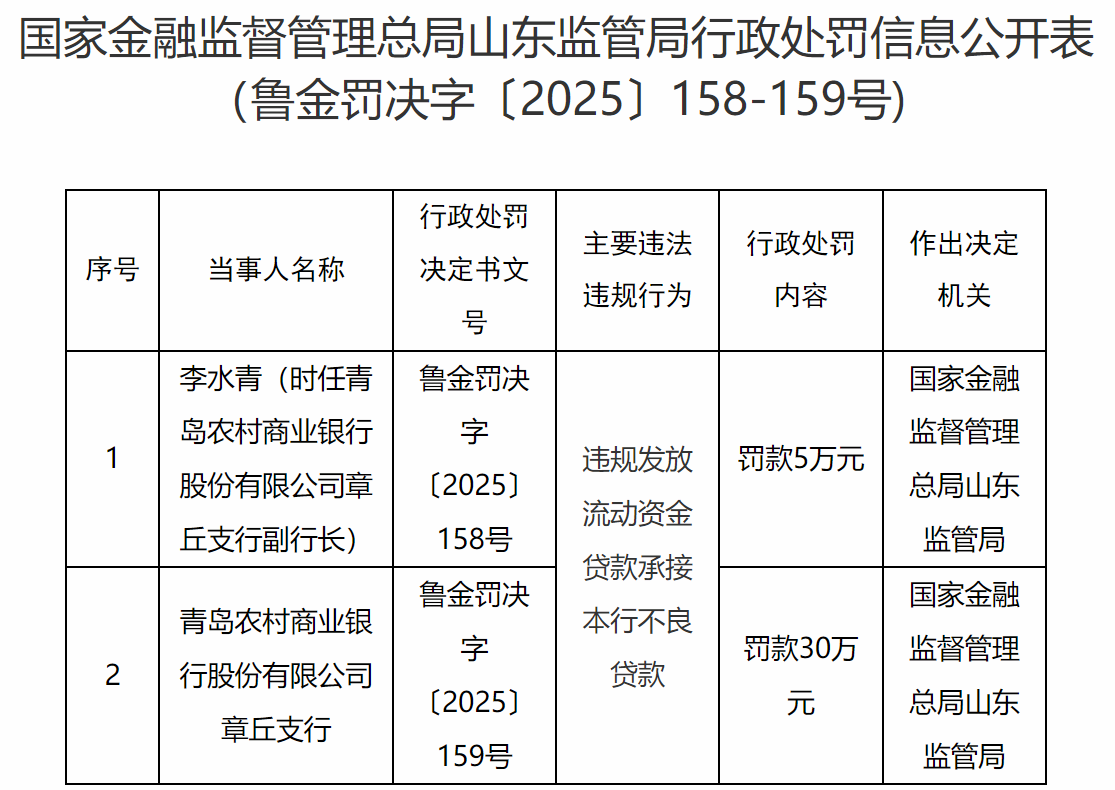 2025年12月31日,国家金融监督管理总局山东监管局发布的行政处罚信息显示,因违规发放流动资金贷款承接本行不良贷款,青岛农村商业银行股份有限公司章丘支行被罚款30万元,时任青岛农村商业银行股份有限公司章丘支行副行长李水青被罚款5万元。