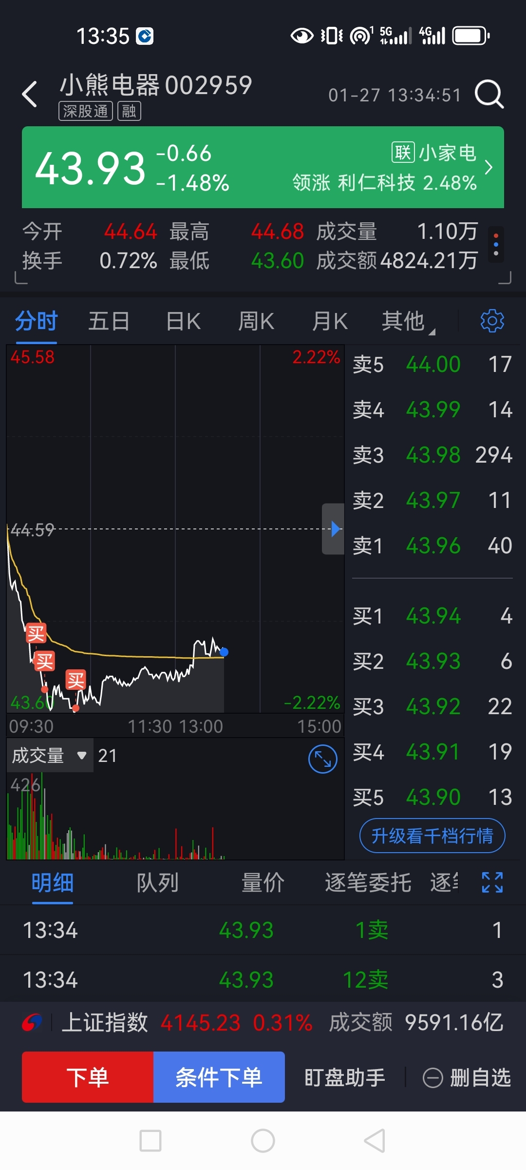 $小熊电器(SZ002959)$ 小熊电器 43.98挂卖单的人,修你们的仙人了(陕西方言)!