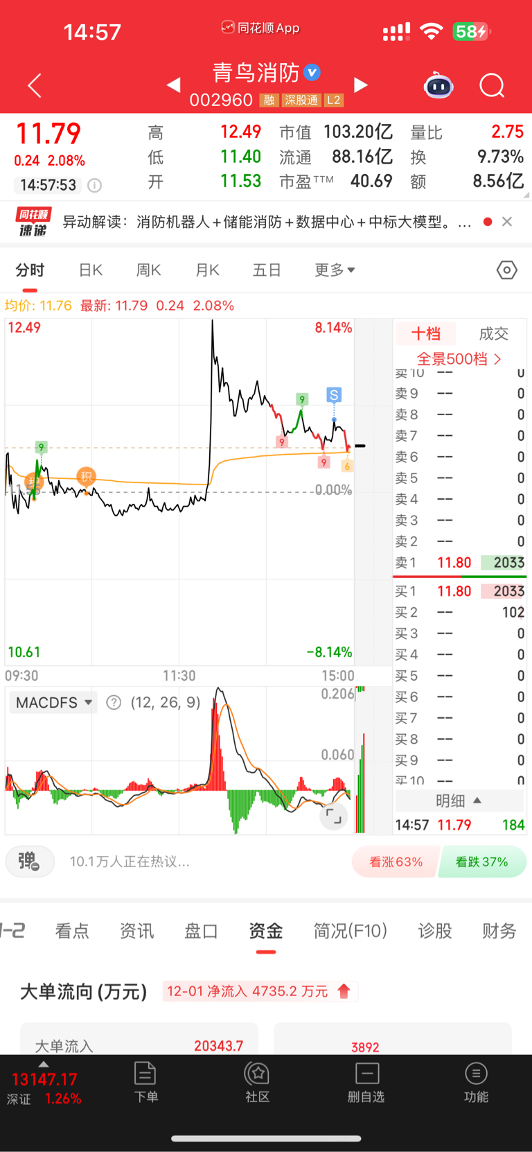 $青鸟消防(SZ002960)$ 3个多点走了,了