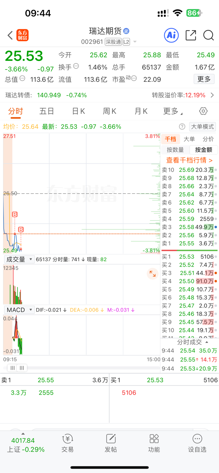 $瑞达期货(SZ002961)$ 明少买入瑞达