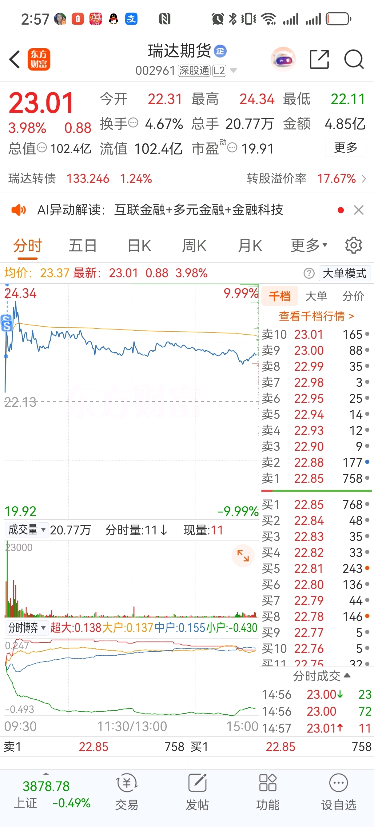 $瑞达期货(SZ002961)$ 一半仓位卖飞了,一半在涨停板卖的,谢谢主力