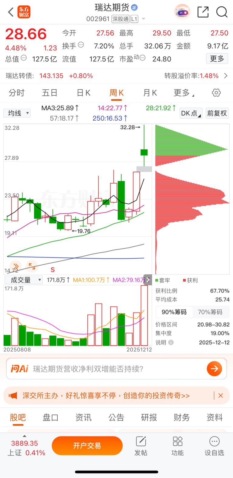$瑞达期货(SZ002961)$ 周线上,见顶回落