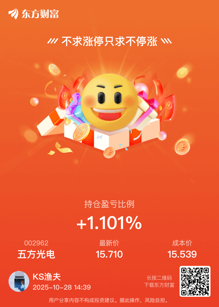 $五方光电(SZ002962)$ #炒股日记# 这次进来也有几天了,早上还是亏的,下午飘红,没加仓,先看看再说。