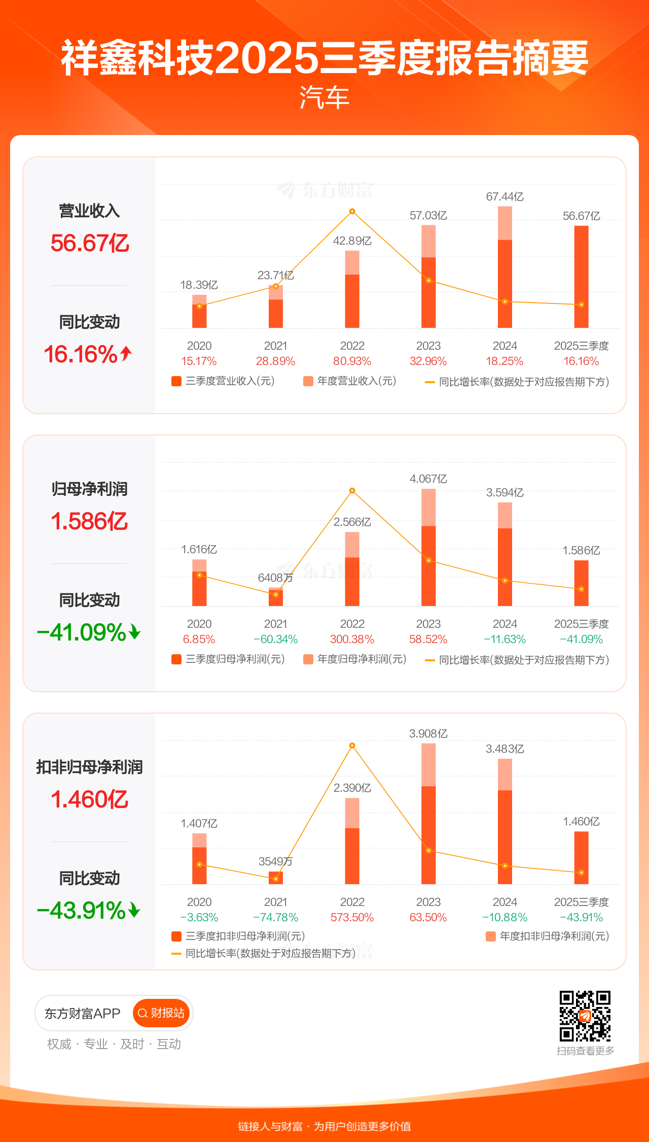 祥鑫科技10月30日发布2025年三季报显示,公司前三季实现营业收入56.67亿元,同比增长16.16%;归母净利润1.59亿元,同比下滑41.09%;扣非归母净利润1.46亿元,同比下滑43.91%。
