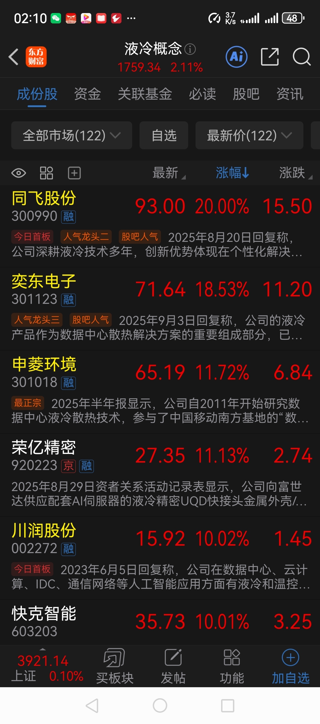 今天的液冷板块大涨