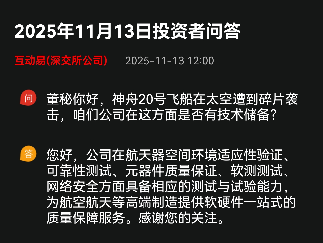 $广电计量(SZ002967)$ 神舟20号航天员乘组将于11月14日,乘坐神舟21号飞船返回东风着陆场。广电要加油
