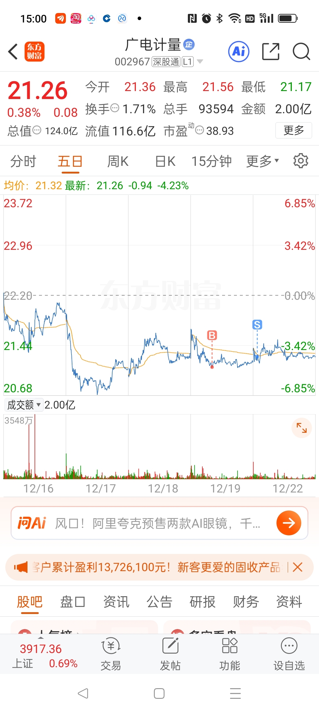 $广电计量(SZ002967)$ 做T失败,没能重新买入,祝福大家明天大涨啊