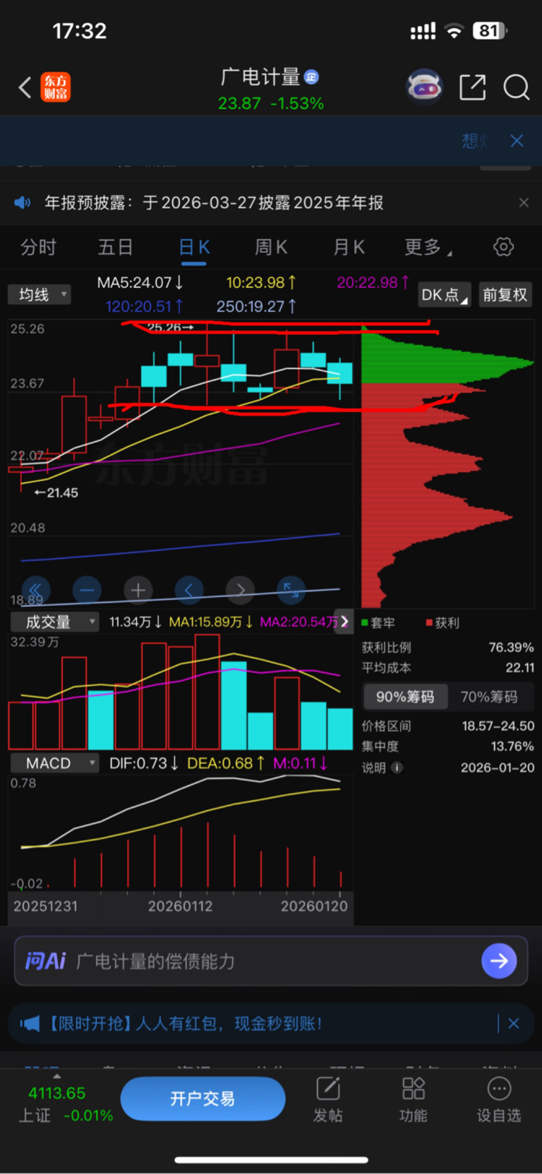 $广电计量(SZ002967)$ 定增票就这样了,23.5-24.5区间震荡,没啥好看的.明天大概率弱反弹.后天继续跌.大后天再反弹.做短线的别和此票硬刚了.没意思的.紧盯放量突破平台并站稳就是买点.跌破平台就是卖点.区间震荡收痒的话就做做T.