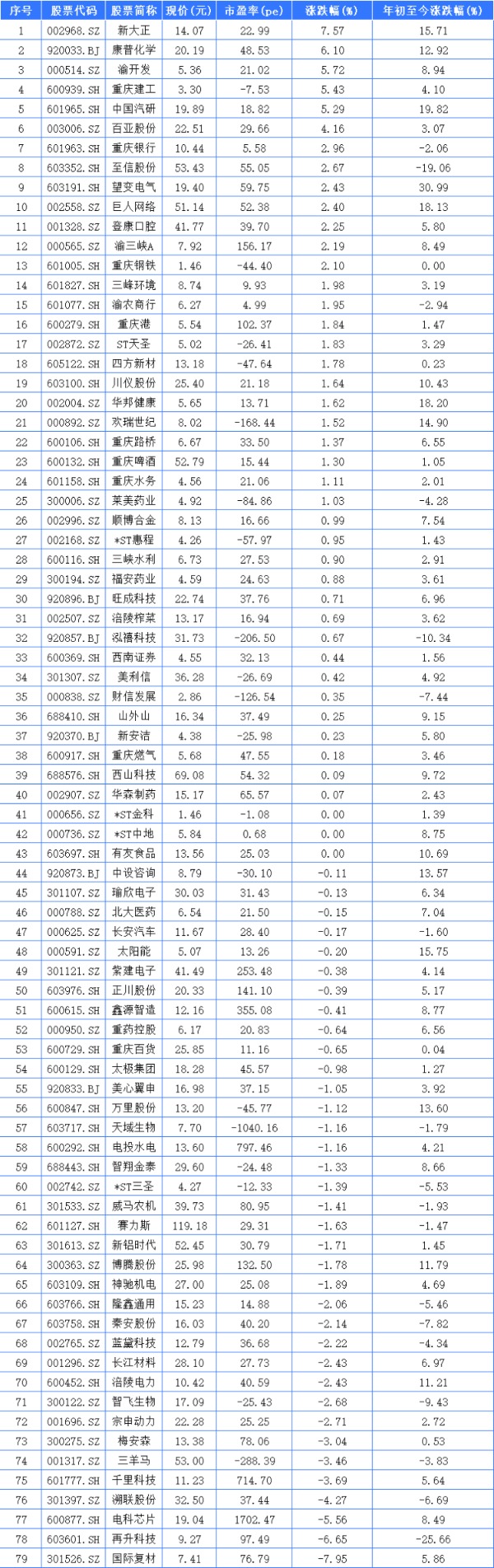 1月20日,79家重庆A股上市公司中有40家上涨,3家平收,下跌36家。