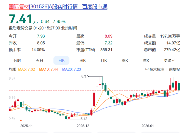 国际复材报收7.41元,日涨幅-7.95%,换手率14.09%,今年以来的涨幅为5.86%。