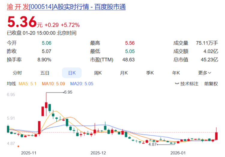 渝开发报收5.36元,日涨幅5.72%,列第三,换手率8.90%,今年以来的涨幅为8.94%。