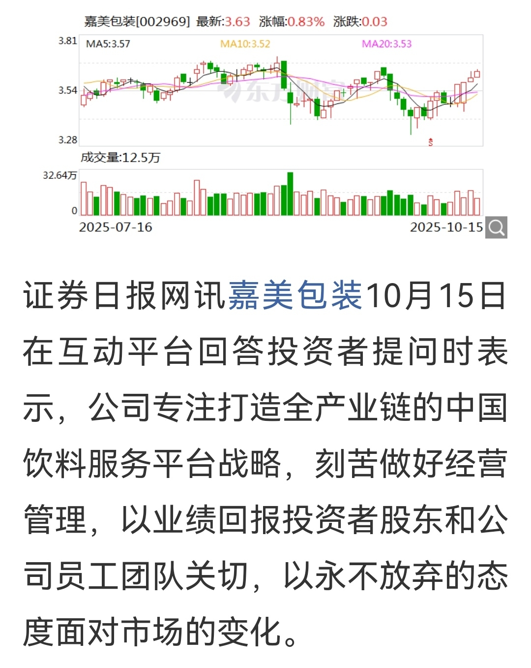 嘉美包装的股吧里满是抱怨的人!炒股票常赚钱本身就是概率的事,如果你自己都不相信自己的选择是对的,那为什么还要焦虑不安,左右自己的情绪呢?