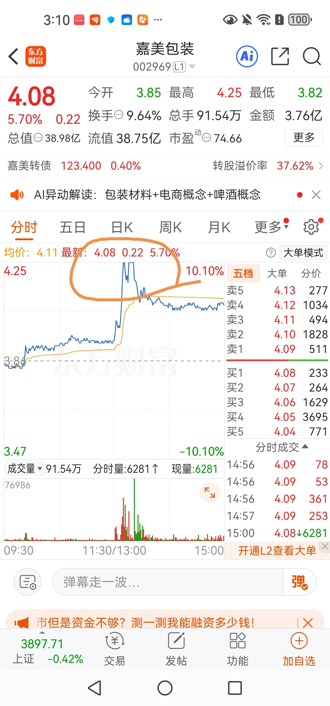 嘉美包装这个位置主力上涨停板但是没合力,明天只有30%概率继续冲板,所以我的建议是拿可转债,可转债没多少跌幅,优先控制风险,再考虑寻求机会。