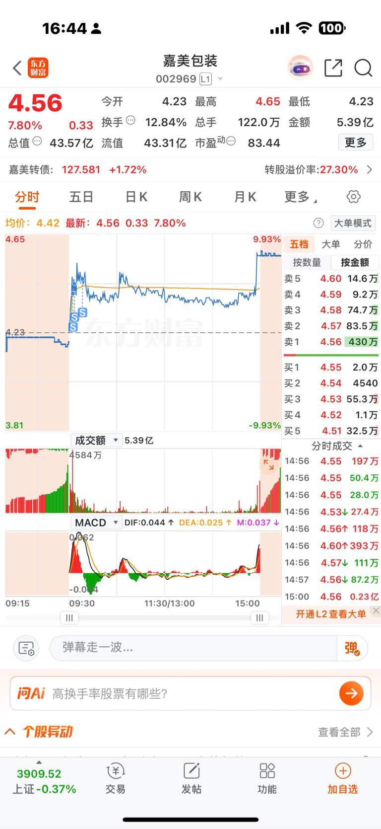 $嘉美包装(SZ002969)$ 这么涨我可是拿不住,必须上午半小时涨停才行。