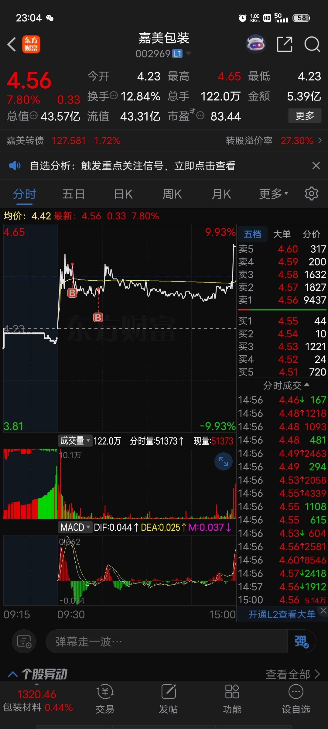$嘉美包装(SZ002969)$ 终于一次运气好的了。模式内的交易没想到来了次停牌!嘿嘿。。原本今天的走势就挺奇怪的,尾盘拉的也奇怪。按理说开盘那么大的量那么坚决弱转强,今天是很强势的,结果没板不说一路下跌,尾盘还拉成这样?现在,一切都有了答案呐!