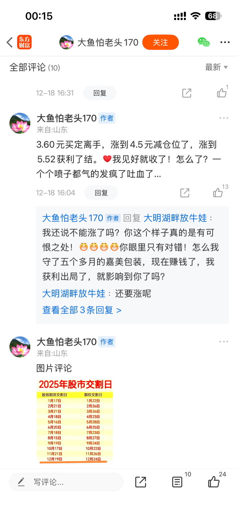 大号忽悠别人减持,小号回复已减持,说是获利了结,我看是4.5割肉离场,要不怎么疯疯癫癫,走火入魔,别人卖飞只是懊恼,它像一样叫人别买,外面的散户买的到吗,说别人是托,我看你最像托