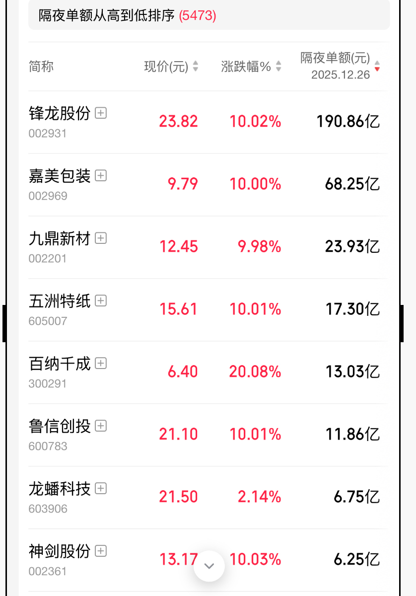 隔夜盘数据,嘉美包装排第二,你们叫吧,没一点用。