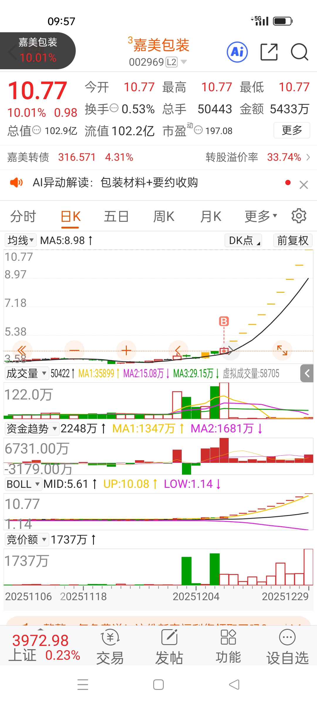 $嘉美包装(SZ002969)$ 竞价放巨量,承接力极强,资金高度认可,开板后应该会有几天的震荡,后续看好,希望能走出趋势。