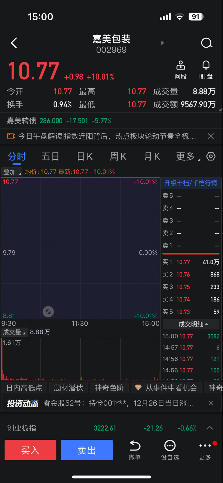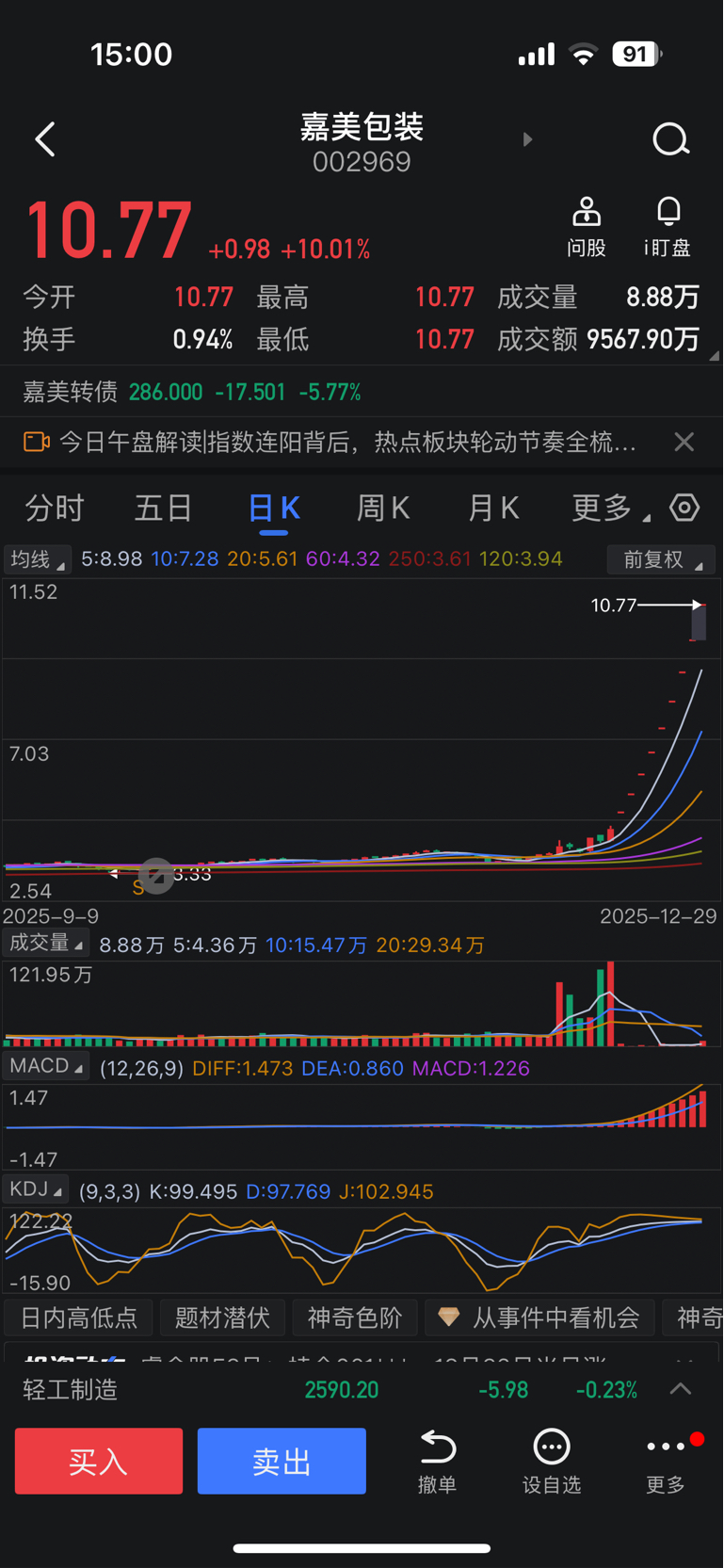 来了!来了!它来了!骑着毛驴它来了!今天是嘉美包装上涨以来第一波抛压,在这里我想