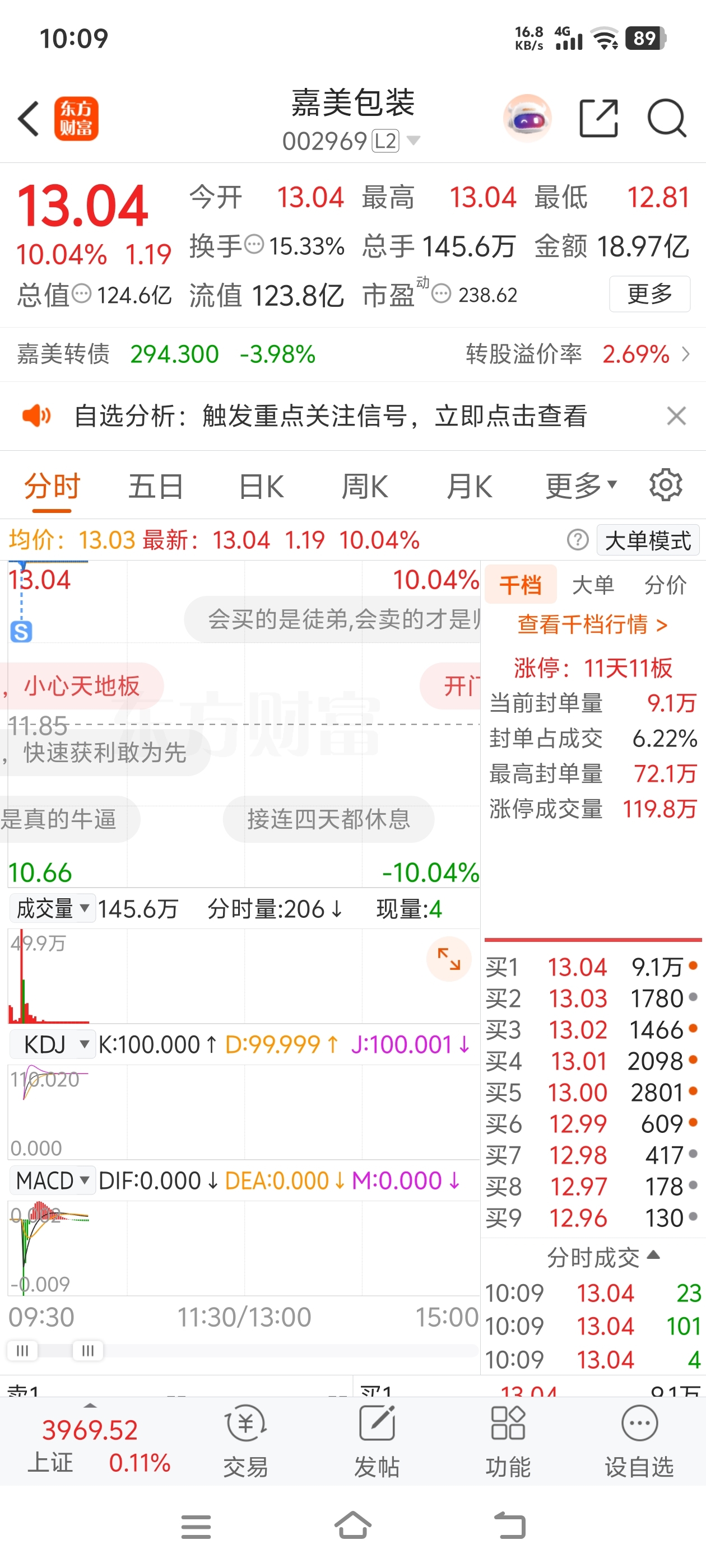 $嘉美包装(SZ002969)$ 各位,我走了,顶不住压力,看封单只有十几万手才撤退的,别骂我,希望大家能赚钱