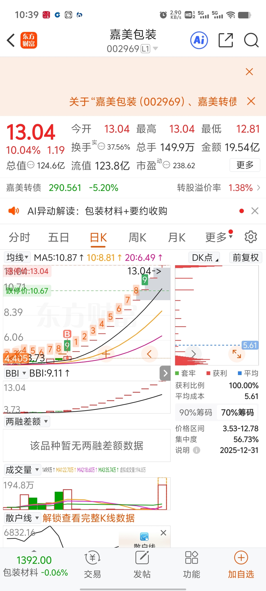 $嘉美包装(SZ002969)$ 好消息买了,吃了多个张婷,坏消息只买一千股,在别的位置亏了!!!T王们我换别的券商了
