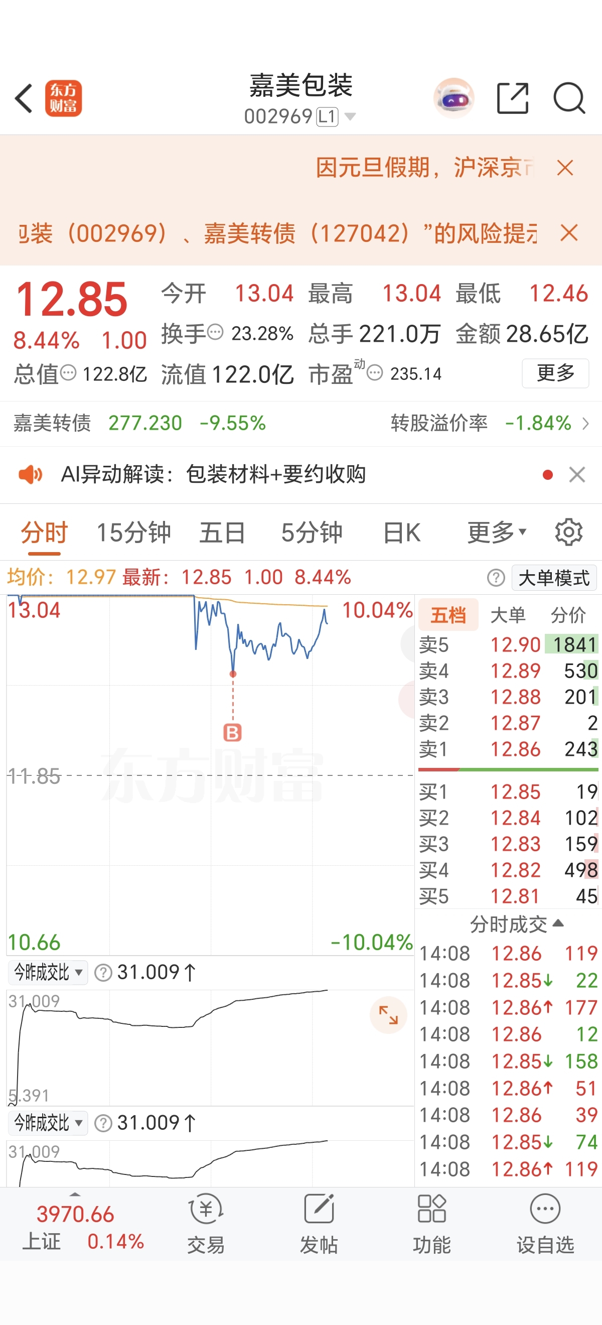 $嘉美包装(SZ002969)$ 今天全仓杀入去了,14.30分涨停,1月4日开盘一字板涨停,今天买到就是赚,胆大的吃肉,胆小的吃面