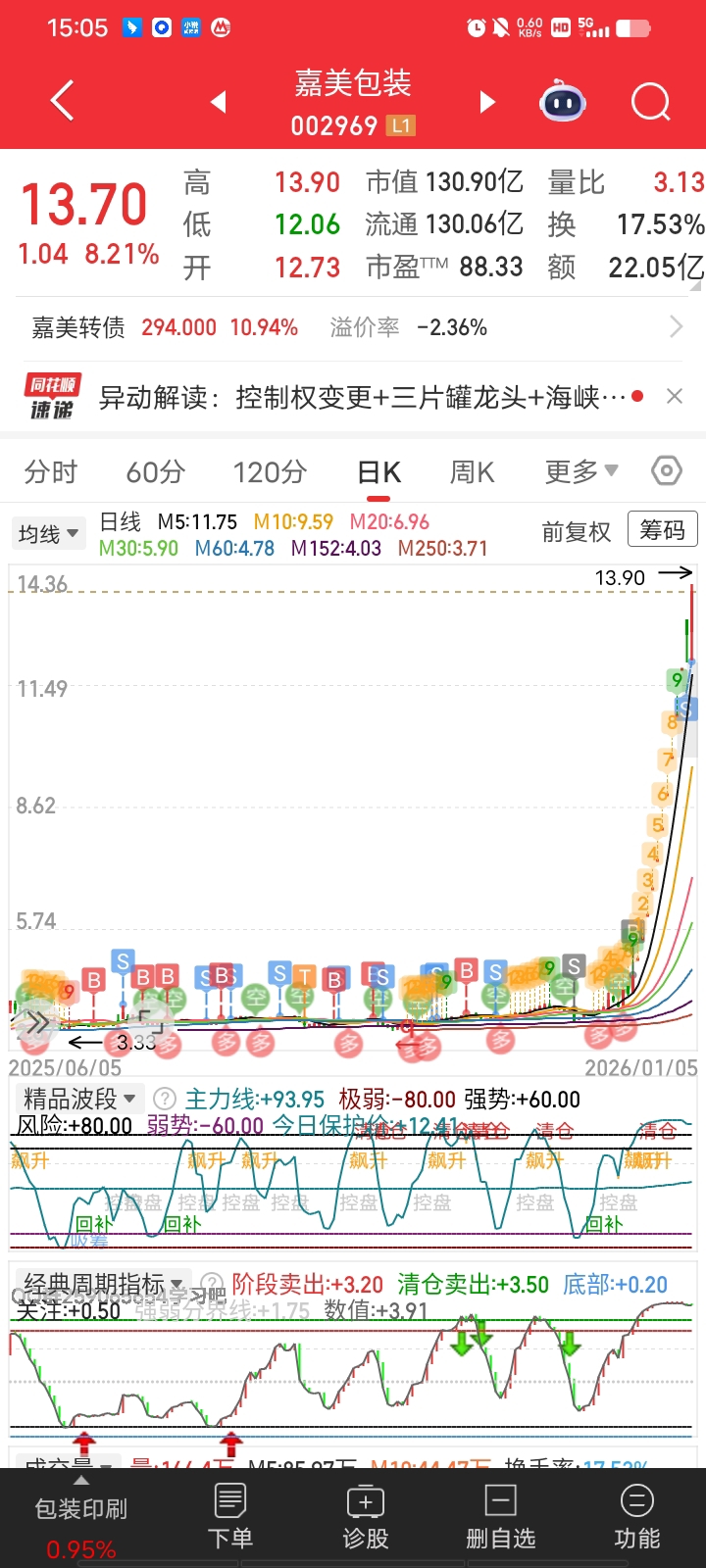 $嘉美包装(SZ002969)$ 感谢俞总,感谢各位游资,感谢大家,13年终于丝逆袭了,我卖了,留下的兄弟发财,11万股全部清仓。