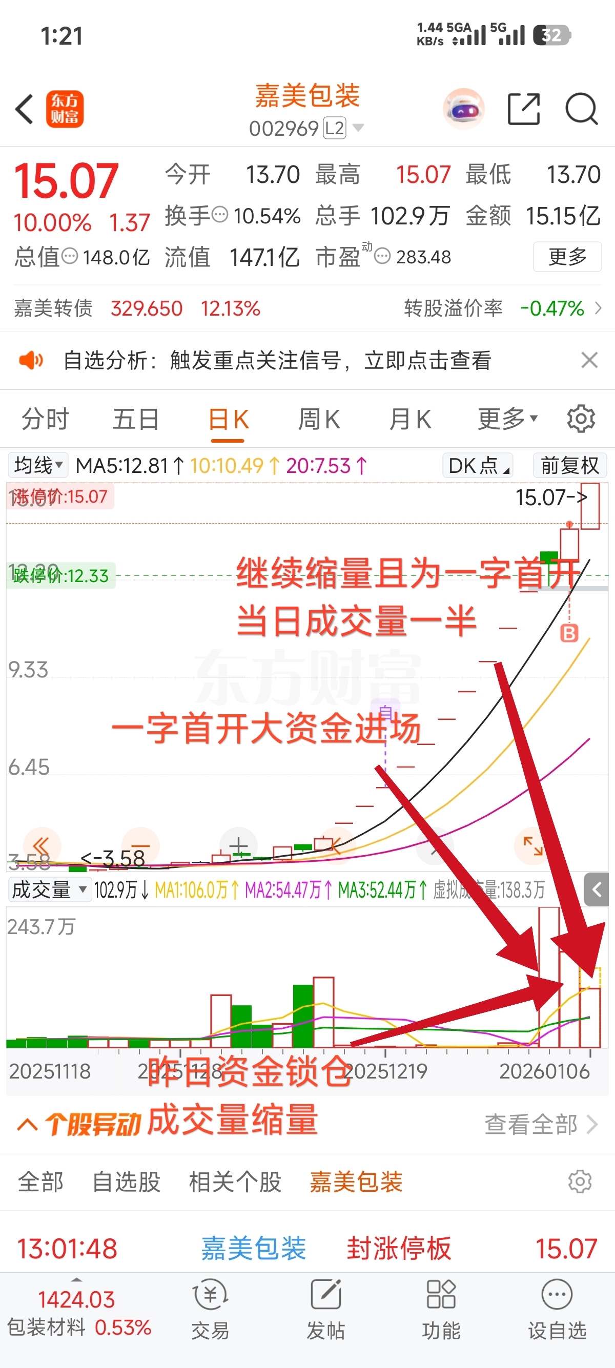 $嘉美包装(SZ002969)$ 理想是12%换手,这里两种走法,一种是保持10%左右换手横盘洗盘(天普的走法)。第二种是靠主力锁仓场内流动性低直接顶上去,切记重组票不是看多少个板,是看估值是多少,监管这些只会延长但最终都是一样结果,市值虽迟但到。这里我个人看估值锋龙400亿>嘉美300亿>胜通250亿。