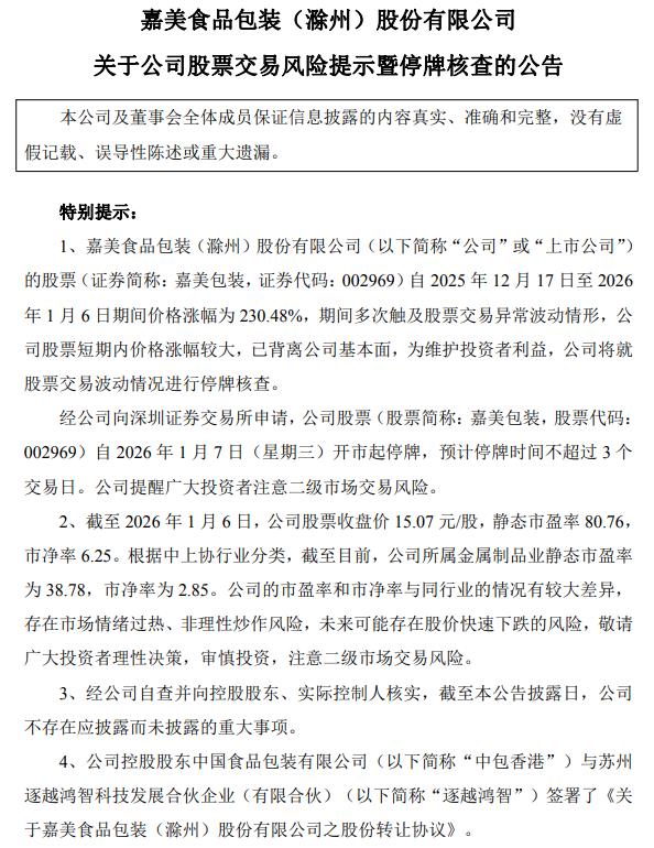 1月6日,嘉美包装(002969.SZ)公告称,公司股票自2025年12月17日至2026年1月6日期间价格涨幅为230.48%,已背离公司基本面。为维护投资者利益,公司将就股票交易波动情况进行停牌核查。公司股票自2026年1月7日起停牌,预计停牌时间不超过3个交易日。同时,公司提醒广大投资者注意二级市场交易风险,包括市盈率和市净率与同行业有较大差异,存在市场情绪过热、非理性炒作风险,未来可能存在股价快速下跌的风险。此外,公司控股股东中国食品包装有限公司与苏州逐越鸿智科技发展合伙企业签署了《关于嘉美食品包装(滁州)股份有限公司之股份转让协议》,可能导致公司控股股东及实际控制人发生变更。但相关事项能否最终完成实施以及完成时间尚存在不确定性。