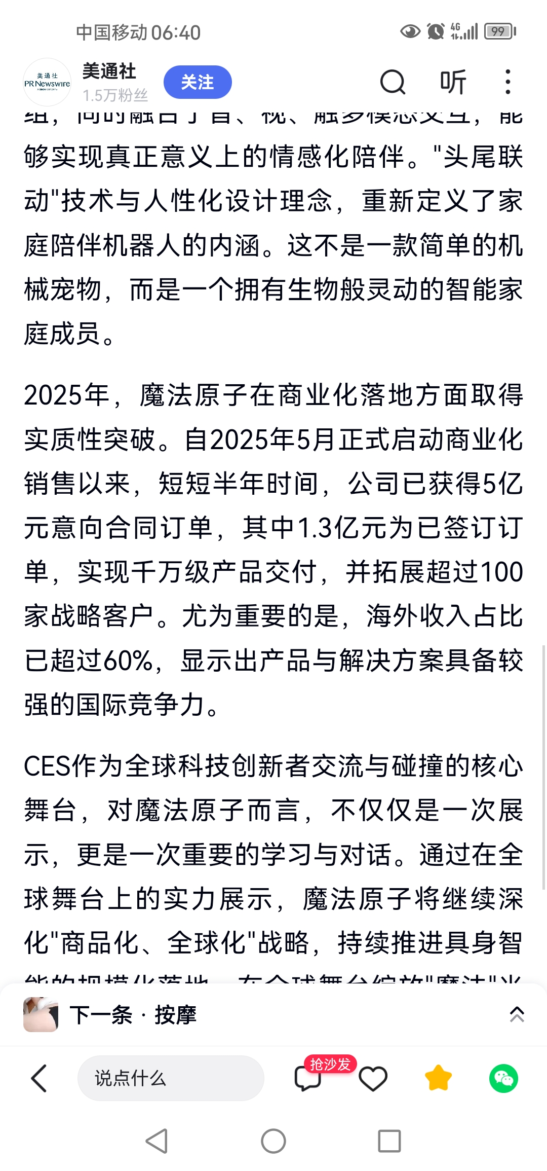 看了下宇树智元们的订单金额,似乎每次订单金额都在亿元左右甚至于数千万级。这与魔法原子一次获得5亿大单真的不可同日而语。单就订单金额来说,宇树智元是萤火虫而魔法原子是太阳!耍知道,魔法原子从25年5月商业化以来仅仅半年时间,再假以时日订单金额难以想象。因为魔法原子有宇树们难以企及的优势,追觅在全球有6500家门店,服务全球2100万家庭,会员数3000万。这也是魔法原子仅仅商业化半年时间就获得5亿大单的根本原因。