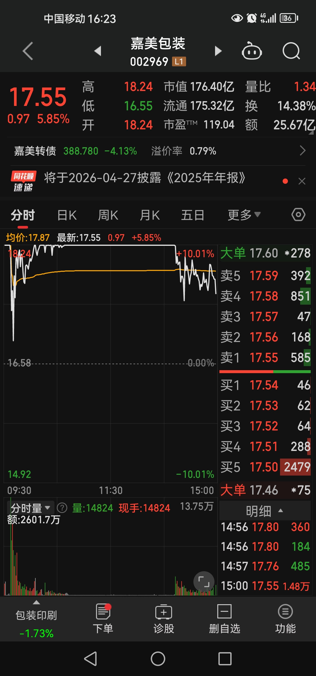 庄稼希望嘉美是上纬,收了两个585,688585是上纬代码。不仅涨幅是5.85,更是在收盘仿价挂了585。但愿庄稼不是在戏弄我们,而是由衷地希望自己是688585。