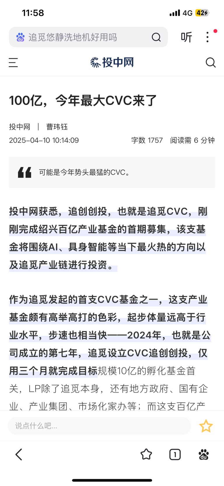 追觅科技还有自己VC追创创投2025年就融资100亿,由追觅科技俞浩的苏州天空工