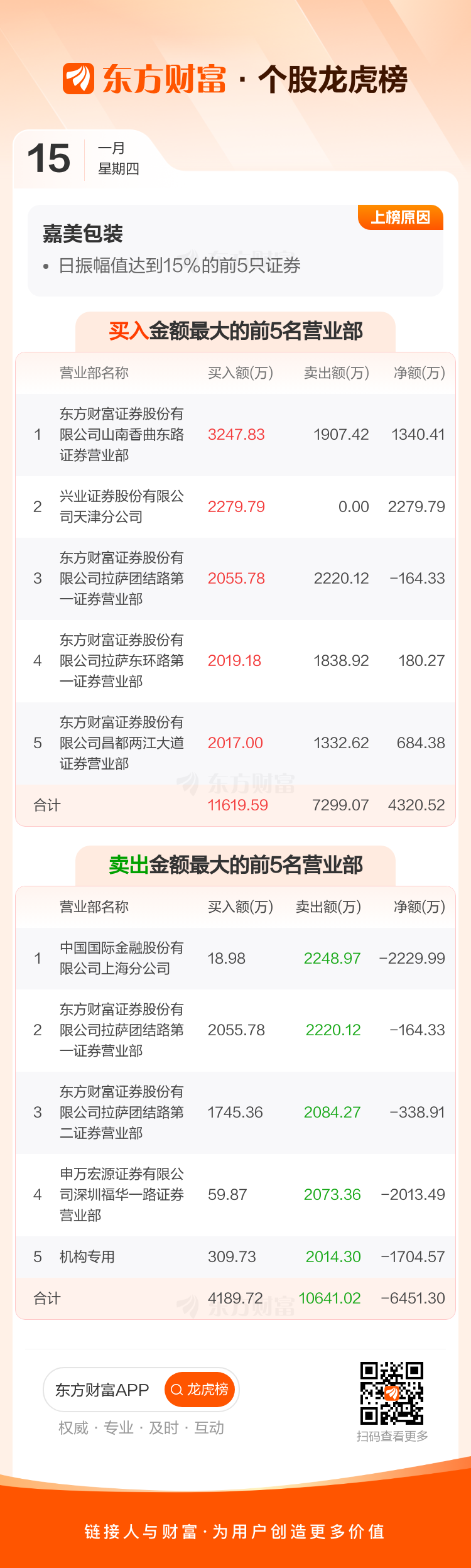 交易所2026年1月15日公布的交易公开信息显示,嘉美包装因成为日振幅值达到15%的前5只证券上榜。嘉美包装当日收报17.38元,涨跌幅-9.99%,偏离值17.95%,换手率13.38%,成交额24.90亿。