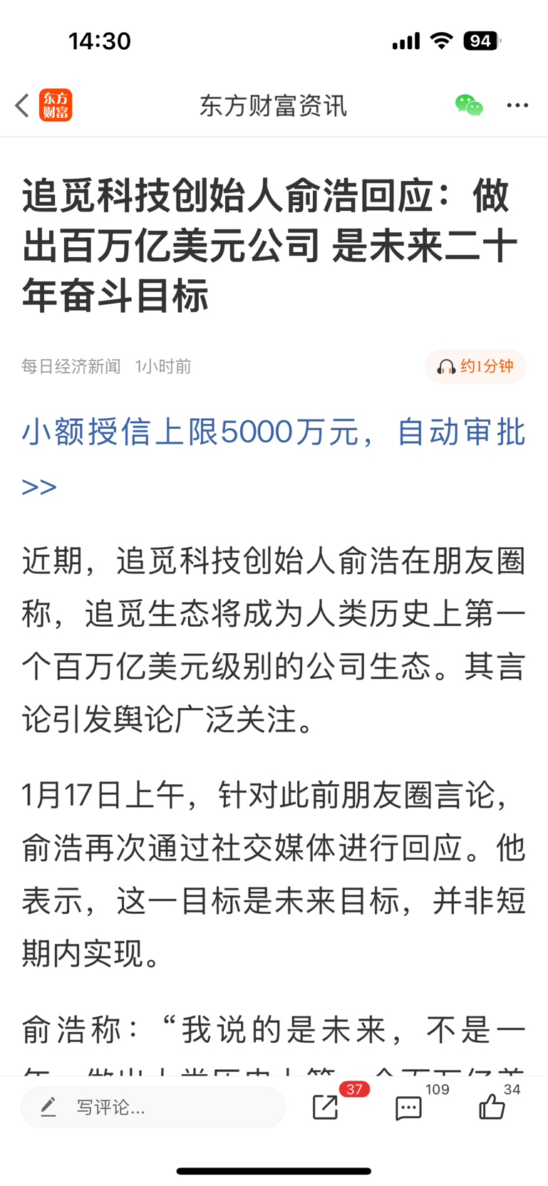俞浩!20年百万亿美元公司绝对是在吹大牛!我认为以俞总玩资本的手段:并购、融资、人材引进,顶多4~5年内能玩成目标。