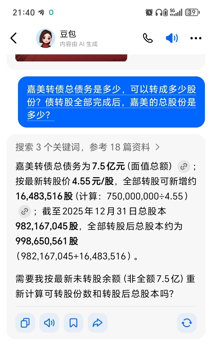 $嘉美包装(SZ002969)$ 嘉美债转股全部完成后,总股份是9.98亿股。