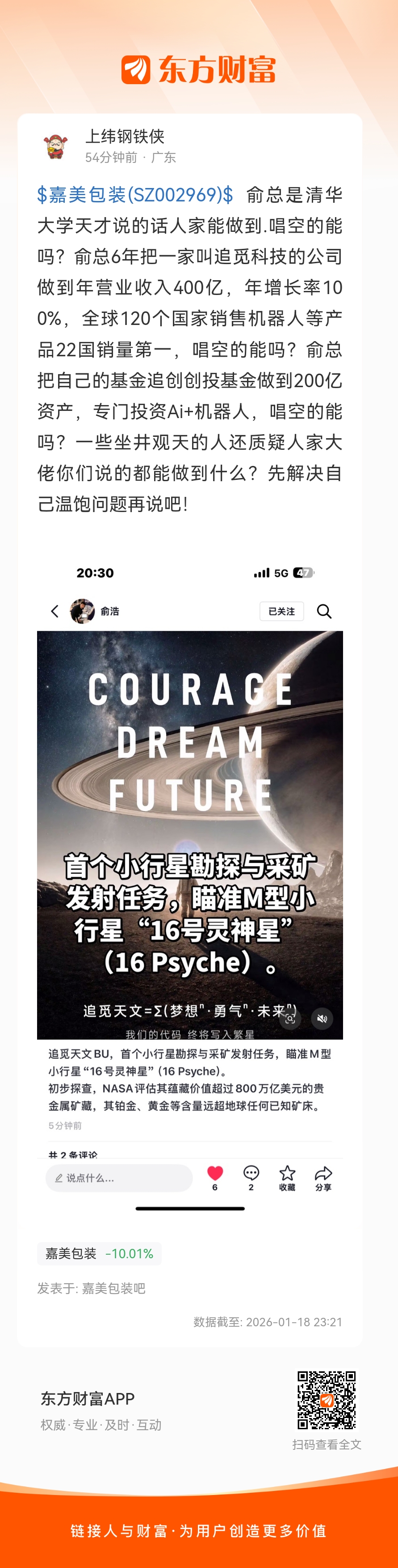 $嘉美包装(SZ002969)$ 俞总是清华大学天才说的话人家能做到.唱空的能吗?俞总6年把一家叫追觅科技的公司做到年营业收入400亿,年增长率100%,全球120个国家销售机器人等产品22国销量第一,唱空的能吗?俞总把自己的基金追创创投基金做到200亿资产,专门投资Ai+机器人,唱空的能吗?一些坐井观天的人还质疑人家大佬你们说的都能做到什么?先解决自己温饱问题再说吧!