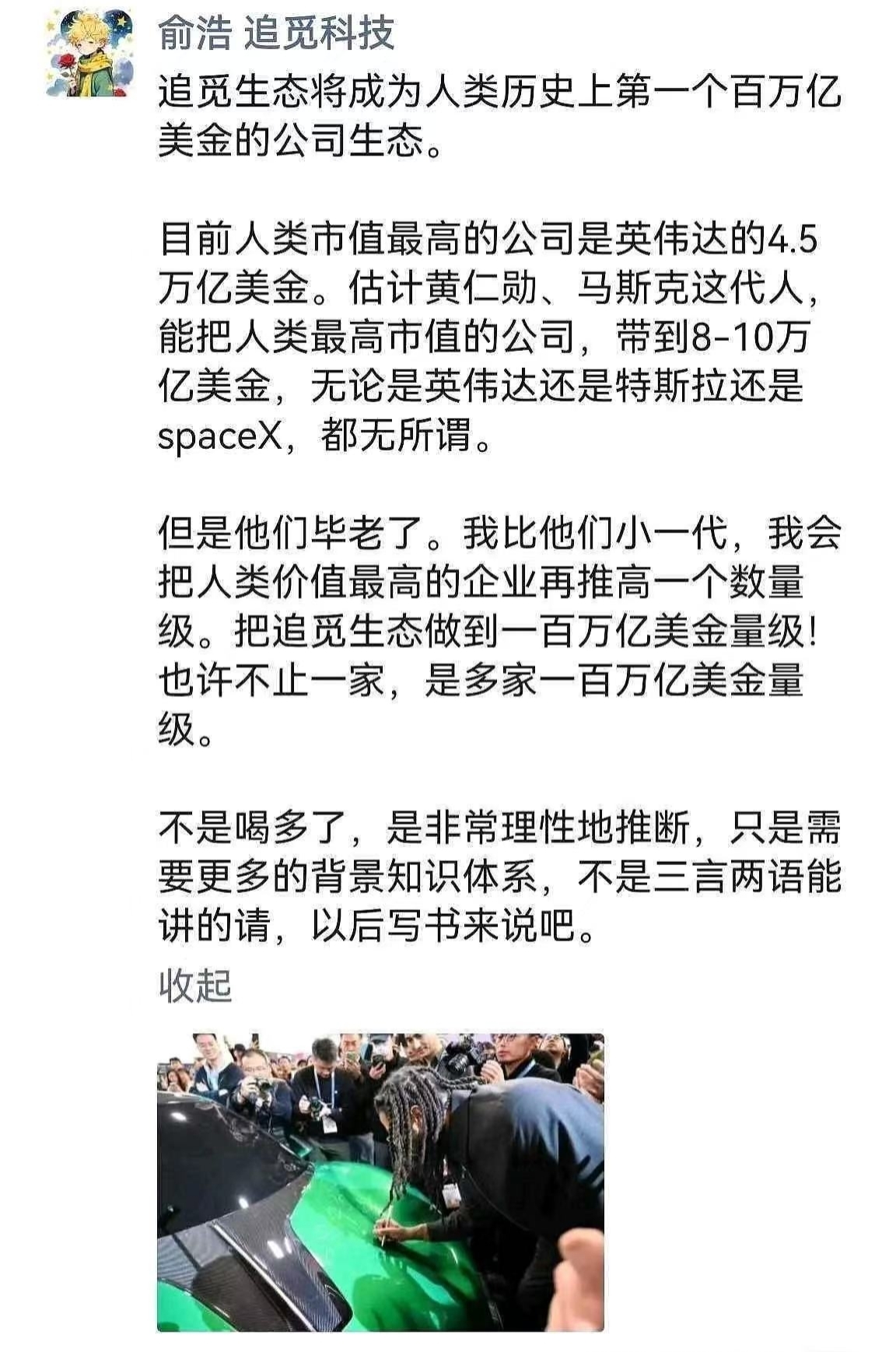 当俞浩那句“百万亿美金生态”的宣言撞进舆论场时,世人的第一反应皆是荒诞。英伟达4.5万亿的市值已是科技之巅,美股全域不过66万亿,大A尽数盘桓才110万亿人民币,百万亿美金,是超美股的磅礴,是7倍大A的浩瀚,是22个英伟达的叠加,这般数字像天方夜谭,初闻时谁都觉是酒后胡言。尤其是当这宣言和嘉美包装的股价走势紧紧勾连时,投资者更是看不懂这疯狂的棋局。 可次日,《新华日报》的墨字、《中国基金报》的版面、《华夏时报》的笔触,将这份“疯话”郑重托起,俞浩那句“绝非醉话”的强调,瞬间刺破了大众的惯性认知。于是我们不得不追问,在天才与疯子的那条无形界碑旁,他究竟站在左,还是立在右?而嘉美包装,又会是这场百万亿豪言里的棋子,还是乘风的载体? 世人总爱用既定的标尺丈量未知的野心。就像当年马斯克说要让火箭回收时,满场皆是嘲讽;黄仁勋押注AI芯片时,也多是质疑。彼时的他们,何尝不是被贴上“疯子”的标签?俞浩的底气,从来不是空中楼阁,清华航空航天的底色,四旋翼无人机的拓荒,追觅连续六年年年翻倍的增速,20万转高速马达的全球领先,从清洁电器到造车航天的生态布局,这些是他埋在时光里的基石。他说黄仁勋与马斯克终将老去,年轻一代要再提一个数量级,这份狂傲里,藏着技术者对时代的野心,藏着创业者对生态的执念。