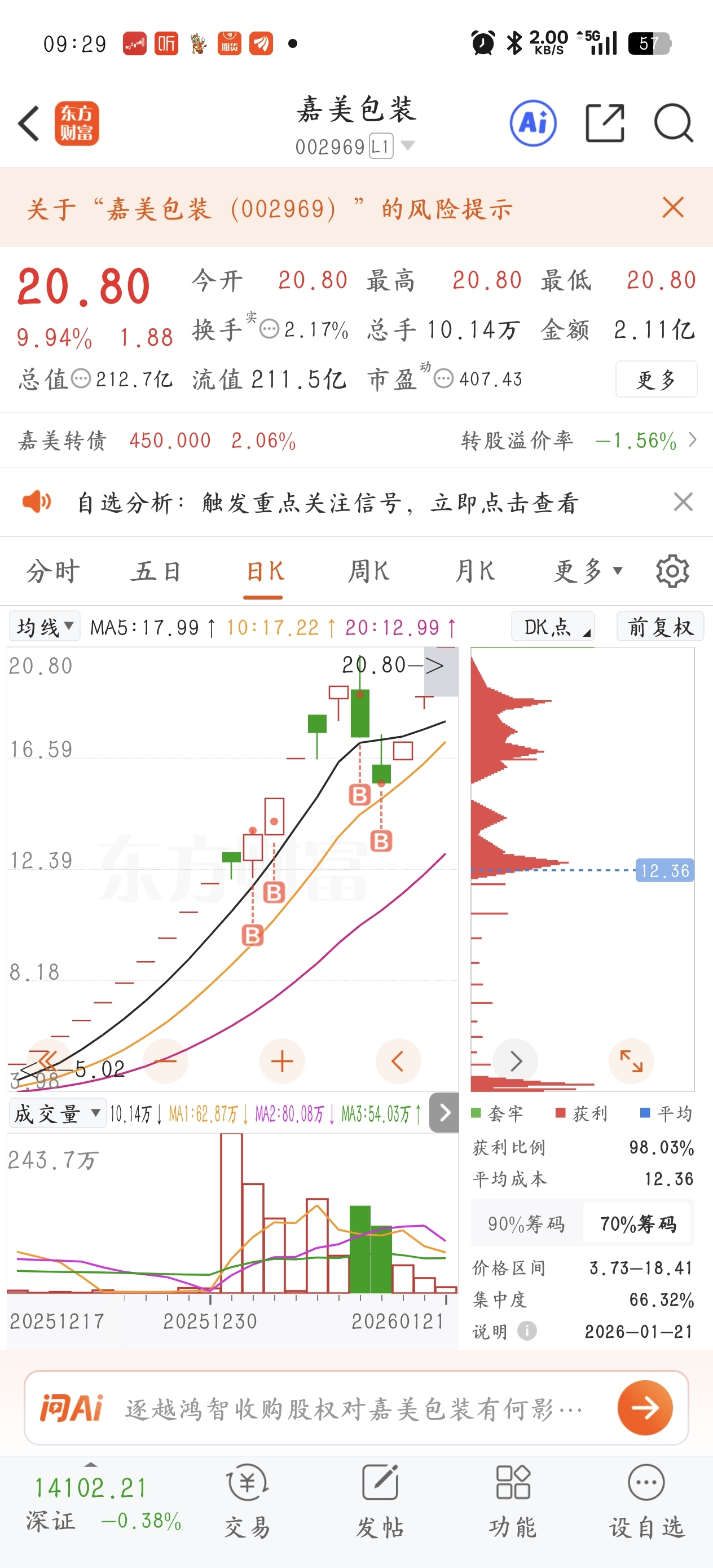 $嘉美包装(SZ002969)$ 今天的分歧是预期内的,今天的节点本身就非常尴尬,前面受整个短线情绪影响硬砸两个跌停,后面修复强势顶几个一字。又是恰好在释放压力的位置,肯定有资金兑现,盘中看承接貌似强实则假强,