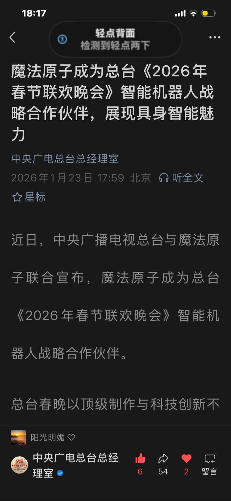 $嘉美包装(SZ002969)$  魔法原子成为总台《2026年春节联欢晚会》智能机器人战略合作伙伴。
