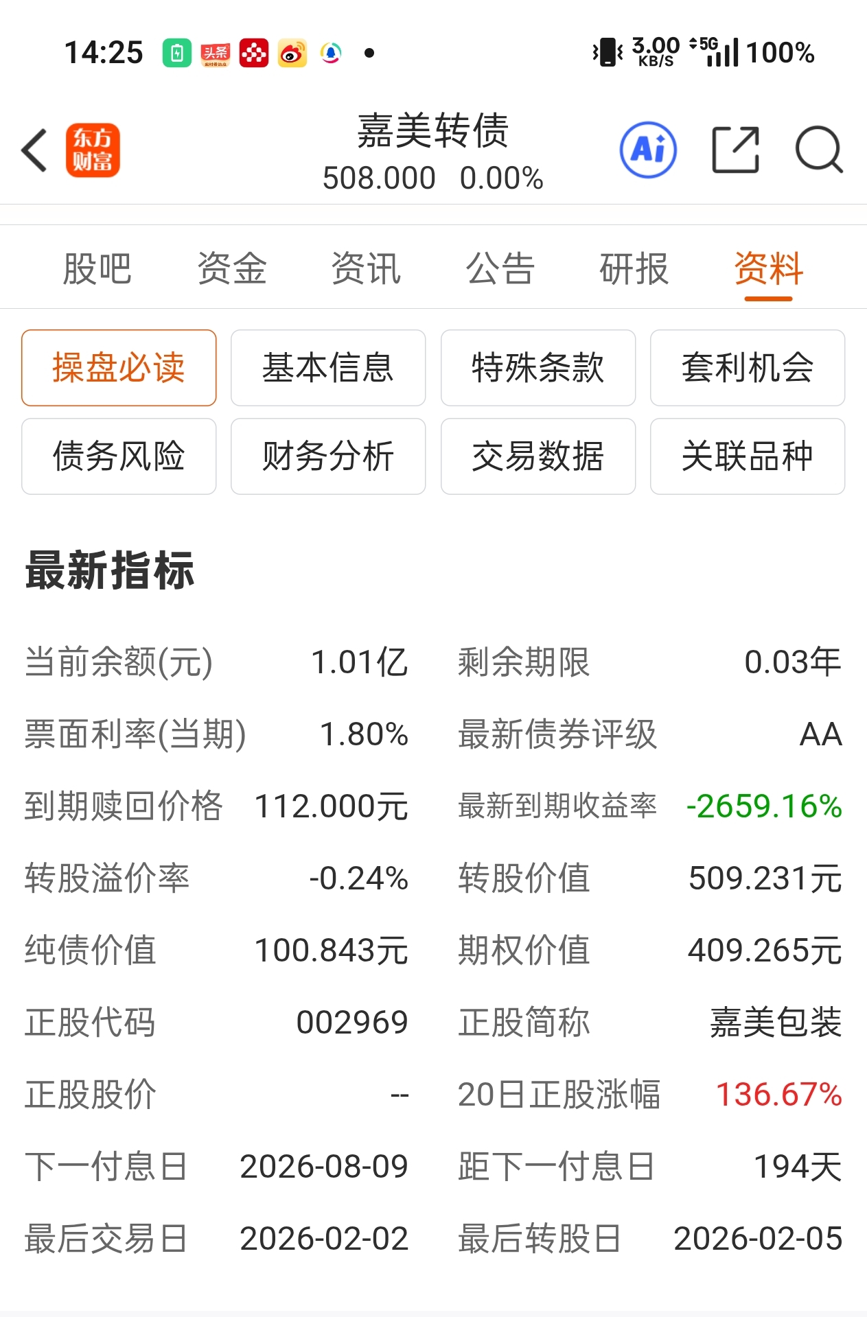 嘉美的转债,只有1个亿了。交易日,还只有一天。这点量,这个时间点,精准到位。