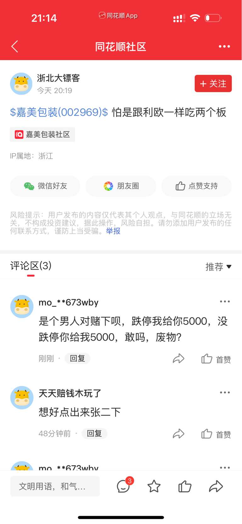 $嘉美包装(SZ002969)$ 看跌的来对d下,嘉美周一跌停我给你5000,没跌停你给我5000,别吵了没意思,直接对d下,不给qjm。